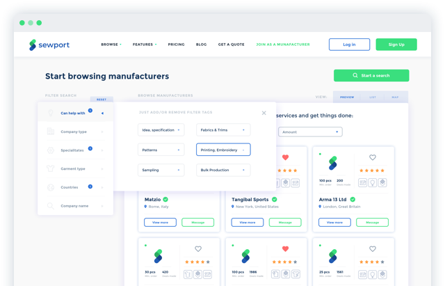 When Sewport strengthened its presence in London attracting bigger clients, we developed a new vision that goes hand in hand with the latest technological trends – creating an online space where every Brand, no matter how big or small, benefits from step-by-step guidance through the clothing manufacturing process and is instantly matched with appropriate service providers from around the World, while manufacturers can easily browse through their projects and engage in business that suits their capabilities
